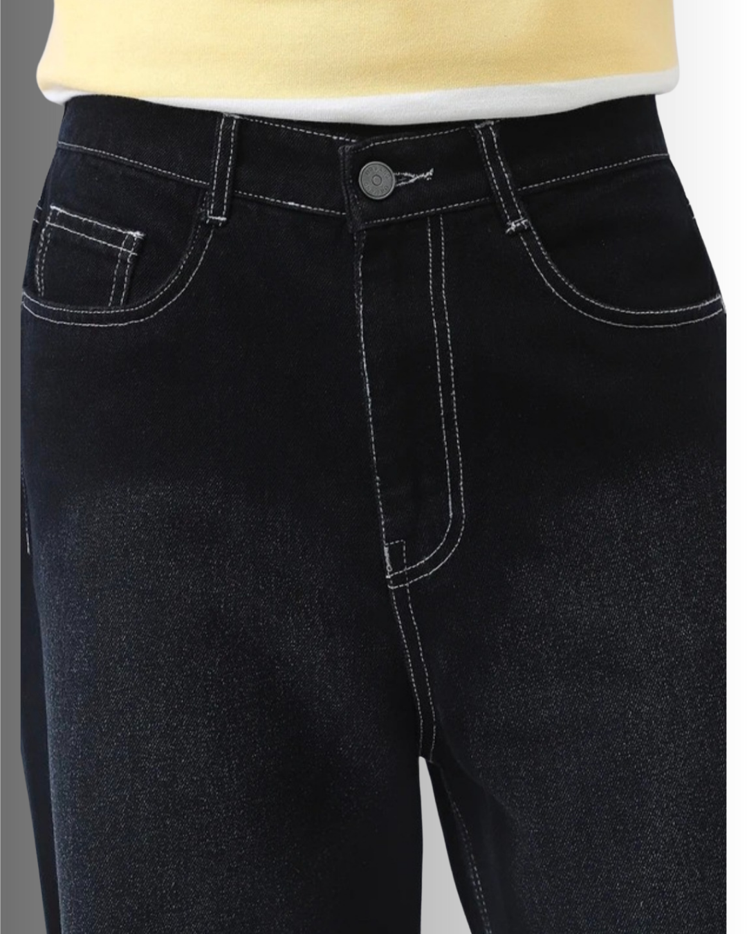 Keywords: high-rise jeans, wide leg jeans, straight fit jeans, non-stretch denim, relaxed fit jeans, zip fly and button closure, metal rivets, durable jeans, versatile jeans, machine washable, premium denim, comfortable jeans